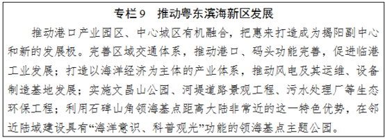 產(chǎn)業(yè)發(fā)展。積極推進(jìn)揭陽(yáng)大南海石化工業(yè)區(qū)、風(fēng)能成套裝備產(chǎn)業(yè)園、海洋高端裝備產(chǎn)業(yè)園等平臺(tái)建設(shè);重點(diǎn)發(fā)展石化、新材料、電力、裝備制造、生物醫(yī)藥、電子信息、現(xiàn)代漁業(yè)等產(chǎn)業(yè);加快度假、養(yǎng)生、養(yǎng)老等旅游產(chǎn)品開(kāi)發(fā),推進(jìn)靖海等地區(qū)海水增養(yǎng)殖發(fā)展。在神泉、靖海海域布局海上風(fēng)電。