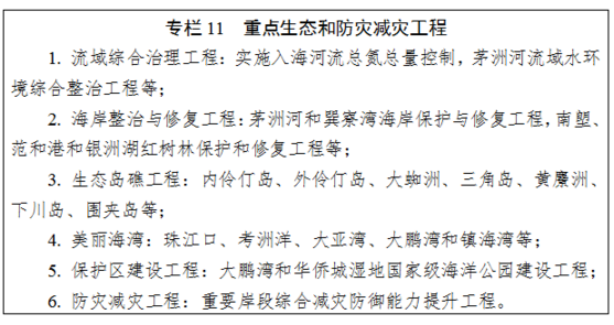 灣區(qū)重點(diǎn)開(kāi)展吳川砂質(zhì)海岸保護(hù)與修復(fù)工程、廉州灣、湛江港、南三島紅樹(shù)林、徐聞珊瑚礁保護(hù)與修復(fù)工程;推進(jìn)南三島生態(tài)島礁工程和湛江港、雷州灣、安鋪港美麗海灣建設(shè);開(kāi)展特呈島和雷州烏石國(guó)家級(jí)海洋公園建設(shè)和湛江東海島石化基地海洋災(zāi)害防御能力提升工程。
