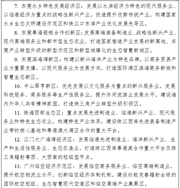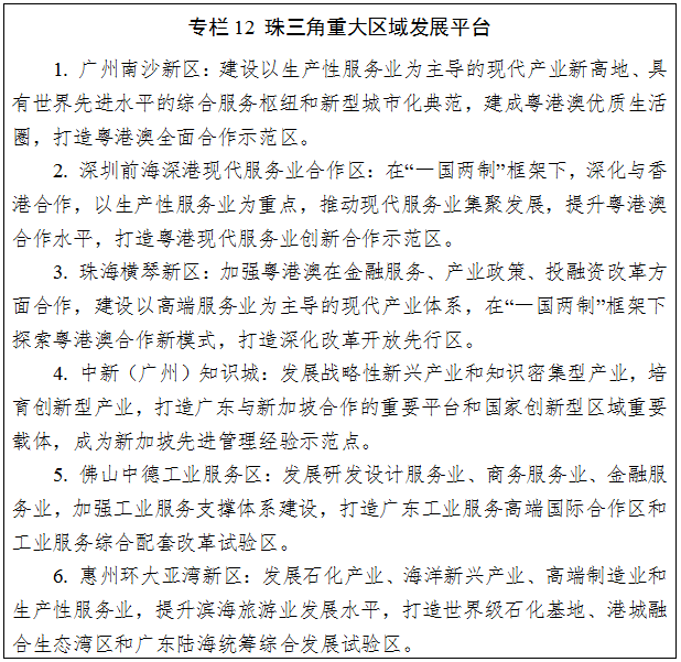 產(chǎn)業(yè)發(fā)展。積極落實(shí)粵港澳大灣區(qū)發(fā)展戰(zhàn)略,發(fā)揮深圳、廣州龍頭帶動(dòng)作用,大力推進(jìn)廣深科技創(chuàng)新走廊建設(shè),形成高度發(fā)達(dá)的創(chuàng)新經(jīng)濟(jì)帶,輻射帶動(dòng)全省創(chuàng)新發(fā)展。打造全球產(chǎn)業(yè)創(chuàng)新高地,建設(shè)具有國(guó)際影響力的戰(zhàn)略性新興產(chǎn)業(yè)高地、信息經(jīng)濟(jì)高地、智能制造高地,重點(diǎn)布局在深圳、廣州、珠海等地。建設(shè)世界級(jí)先進(jìn)的電子信息、裝備制造、石化等產(chǎn)業(yè)基地,重點(diǎn)布局在佛山、惠州、東莞、中山、江門(mén)等。重點(diǎn)打造全球金融中心、全球貿(mào)易中心、全球物流中心、國(guó)際化的消費(fèi)中心、世界休閑旅游中心,主要布局在廣州、深圳。大力發(fā)展廣深珠高端制造業(yè),支持珠海培育智能制造和戰(zhàn)略性新興產(chǎn)業(yè),帶動(dòng)珠江西岸產(chǎn)業(yè)發(fā)展。大力建設(shè)佛山和東莞科技成果轉(zhuǎn)化基地。建設(shè)惠州、中山、江門(mén)等區(qū)域生產(chǎn)制造基地。加快構(gòu)筑區(qū)域發(fā)展重大平臺(tái)。建設(shè)南海油氣資源勘探開(kāi)發(fā)保障基地,加快推進(jìn)天然氣水合物產(chǎn)業(yè)發(fā)展;推動(dòng)江門(mén)循環(huán)經(jīng)濟(jì)和環(huán)保產(chǎn)業(yè)示范區(qū)建設(shè);在港口、桂山、金灣等海域發(fā)展海上風(fēng)電。