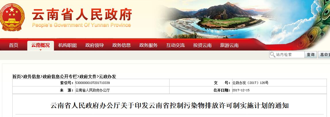 云南省人民政府辦公廳關(guān)于印發(fā)云南省控制污染物排放許可制實施計劃的通知