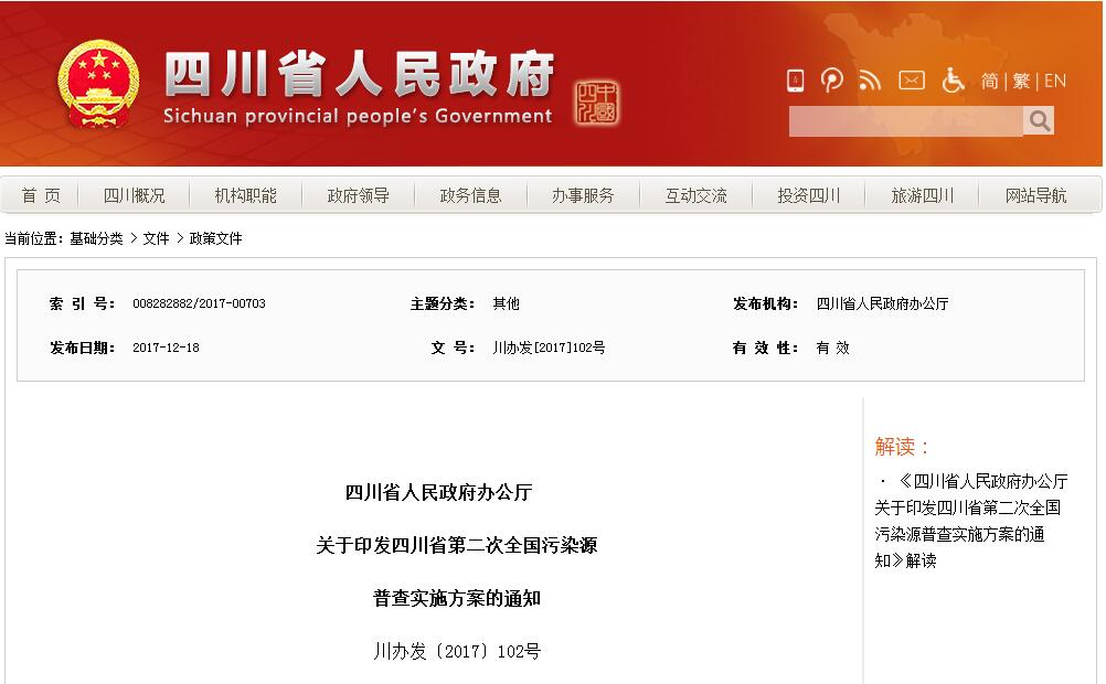 四川省人民政府辦公廳關(guān)于印發(fā)四川省第二次全國(guó)污染源普查實(shí)施方案的通知