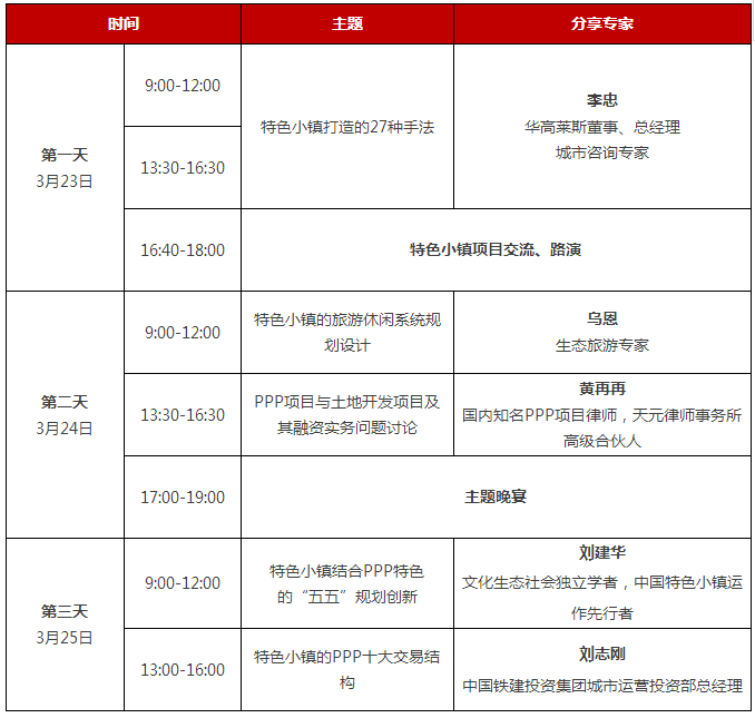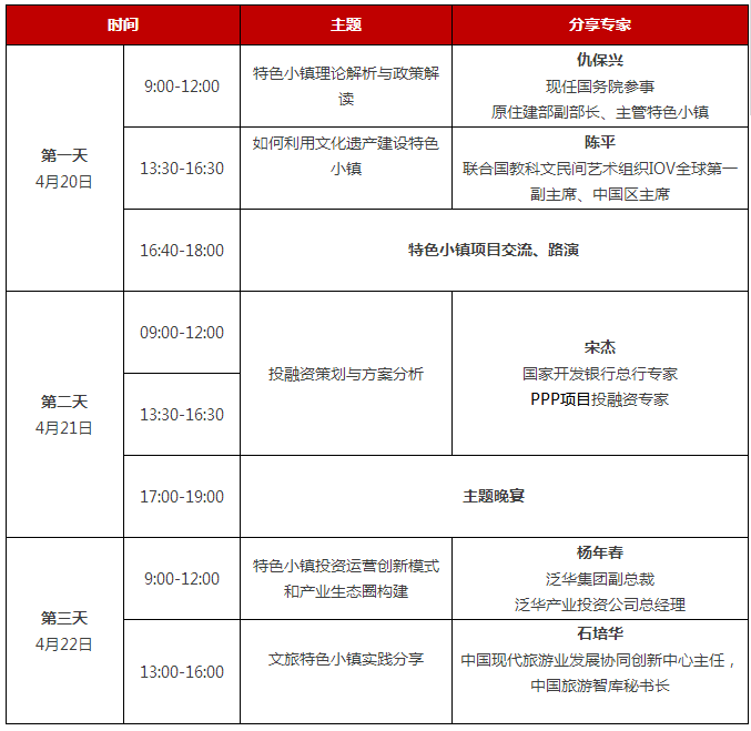 政策解讀、文旅特色小鎮(zhèn)實踐分享、投融資策劃與方案分析、特色小鎮(zhèn)投資運營創(chuàng)新模式和產(chǎn)業(yè)生態(tài)圈構(gòu)建、如何利用文化遺產(chǎn)建設特色小鎮(zhèn)