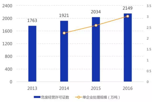 資質(zhì)企業(yè)平均規(guī)模較小:2016年我國(guó)持危險(xiǎn)廢棄物經(jīng)營(yíng)許可證的企業(yè)數(shù)量為2149家,2016年凈增加僅115家,體現(xiàn)出環(huán)保系統(tǒng)對(duì)新頒發(fā)許可證愈發(fā)謹(jǐn)慎;平均每家處理量?jī)H不到3萬(wàn)噸,呈現(xiàn)較強(qiáng)的分散性特征,但單企業(yè)處理規(guī)模由2014年2.2萬(wàn)噸/年增加到2016年3.0萬(wàn)噸/年,未來(lái)隨著許可證頒發(fā)與復(fù)核難度加大,實(shí)力弱、技術(shù)差的小企業(yè)將被淘汰出市場(chǎng),龍頭擴(kuò)張,單企業(yè)規(guī)模繼續(xù)擴(kuò)大。