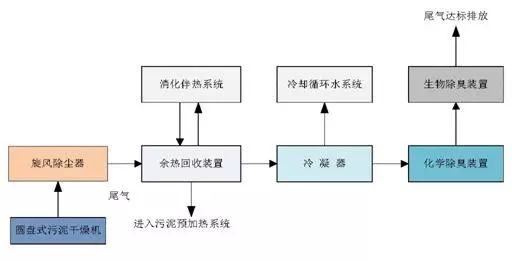 熱量回收系統(tǒng)時(shí)本次設(shè)計(jì)的重點(diǎn),熱干化系統(tǒng)尾氣處理工藝流程圖如下。