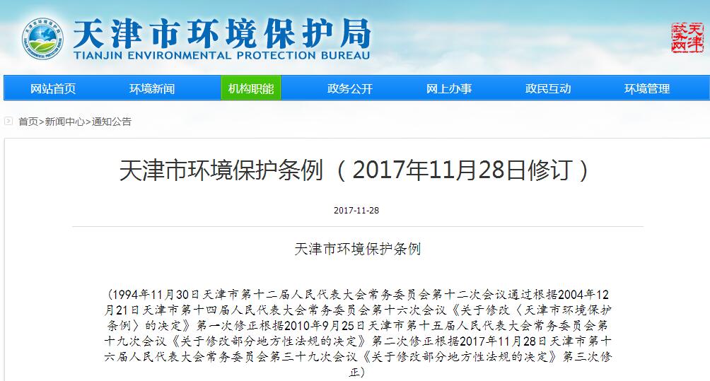 根據(jù)2017年11月28日天津市第十六屆人民代表大會常務委員會第三十九次會議《關(guān)于修改部分地方性法規(guī)的決定》對《天津市環(huán)境保護條例進行第三次修正,以切實保護和改善天津市的生活環(huán)境與生態(tài)環(huán)境,污染防治和其他公害,保障人民群眾身體健康,促進社會主義現(xiàn)代化建設。詳情如下: