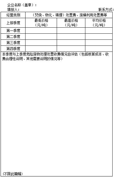 1.各危險廢物經(jīng)營單位從2018年1月起,結(jié)合每季度經(jīng)營情況季報,根據(jù)企業(yè)實際運營情況,按照附表2格式向市固廢管理中心如實報送每季度處理處置收費情況表;并于每年度1月31日前,上報上個年度危險廢物處理處置收費情況,參照附表1格式。