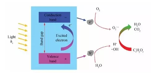 3. 光催化降解:是當半導體材料吸收的光能大于或等于半導體禁帶寬度時,電子由半導體的價帶躍遷到導帶上產(chǎn)生高活性電子e 。同時,在原來的價帶上形成1 個 空 穴h+ 。產(chǎn)生的空穴具有極強的氧化性(即獲取電子的能力),可以與水作用形成羥基自由基·OH),從而直接將有機物降解為小分子物質(zhì)。