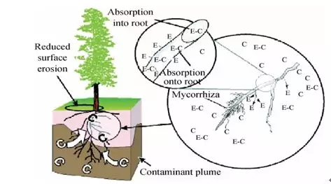 根際降解:根際降解本質(zhì)是植物根部輔助微生物降解。植物根部及其周圍微生物的相互作用,能夠顯著降低石油類污染物的毒性和持久性。首先,植物的非根部分能夠為根部提供必要的營養(yǎng)物質(zhì),促進根的生長 ,并分泌有機物質(zhì),增加石油污染物的生物可利用性;其次,植物根部能夠創(chuàng)造富含糖類、氨基酸、有機酸、維生素 、單寧、生物堿、固醇、生物酶、生長素等營養(yǎng)物質(zhì)的多元有機環(huán)境,從而增強周邊微生物群落的新陳代謝活動; 最后,在根際微生物代謝作用下,將石油污染物降解為自身生長必須的碳源,同時減少石油污染物對植物的毒害作用。