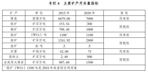 1.礦業(yè)對國民經(jīng)濟的支撐作用得到進一步增強。轉(zhuǎn)變發(fā)展方式,調(diào)整礦業(yè)結(jié)構(gòu),穩(wěn)定石油產(chǎn)量,壓縮煤炭過剩產(chǎn)能,大力發(fā)展石墨、鉬等新材料精深加工業(yè),到2020年全省采礦業(yè)產(chǎn)值力爭達到2500億元。