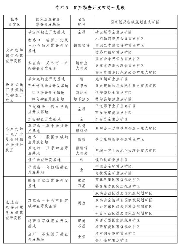 (二)礦產(chǎn)資源勘查開發(fā)基地建設(shè)。在4個勘查開發(fā)區(qū)的基礎(chǔ)上,綜合考慮資源稟賦、開發(fā)利用條件、環(huán)境承載力和區(qū)域產(chǎn)業(yè)布局等因素,劃分出省級勘查開發(fā)基地18個,包括國家級能源資源基地4個。其中大興安嶺銅鉬金勘查開發(fā)區(qū)包括砂寶斯、岔路口-塔河二支線等4個基地;松嫩盆地勘查開發(fā)區(qū)包括紅星等3個基地;小興安嶺-張廣才嶺勘查開發(fā)區(qū)包括三道灣子-西崗子、鹿鳴-二股等7個基地;完達山老爺嶺勘查開發(fā)區(qū)包括金廠-洋灰洞子、鶴崗、雙鴨山-七臺河、雞西4個基地。作為保障國家資源安全供應(yīng)的核心區(qū)域,納入國民經(jīng)濟和社會發(fā)展規(guī)劃以及相關(guān)行業(yè)發(fā)展規(guī)劃中統(tǒng)籌安排和重點建設(shè),在生產(chǎn)力布局、基礎(chǔ)設(shè)施建設(shè)、資源配置、重大項目設(shè)置及相關(guān)產(chǎn)業(yè)政策方面給予支持和保障,大力推進資源規(guī)模開發(fā)和產(chǎn)業(yè)聚焦發(fā)展。