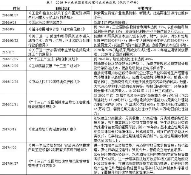 《“十三五”全國(guó)城鎮(zhèn)生活垃圾無(wú)害化處理設(shè)施建設(shè)規(guī)劃》助推垃圾焚燒發(fā)電行業(yè)快速發(fā)展;最新頒布的《國(guó)家危險(xiǎn)廢物名錄》對(duì)于危廢的識(shí)別更加清晰,危廢處理更加有據(jù)可循;《環(huán)境保護(hù)稅法》于2018年1日1日正式施行,“排污費(fèi)改稅”有利于引導(dǎo)排污單位減少污染物排放;《納入排污許可管理的火電等17個(gè)行業(yè)污染物排放量計(jì)算方法(試行)》和《未納入排污許可管理行業(yè)適用的排污系數(shù)、物料衡算方法(試行)》是全面細(xì)化和保障環(huán)保稅法實(shí)施的綜合性配套法規(guī),進(jìn)一步明確環(huán)保稅稅制要素。