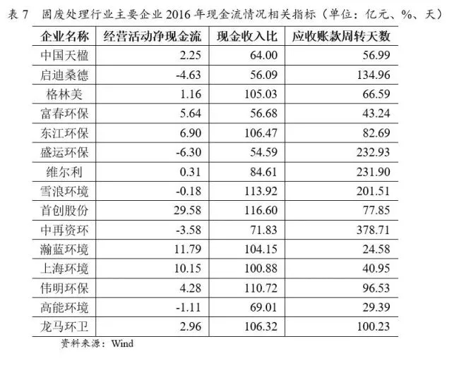 從經(jīng)營(yíng)效率指標(biāo)來(lái)看,固廢處理行業(yè)的應(yīng)收賬款普遍很高,由于預(yù)算內(nèi)撥款被占用,導(dǎo)致賬面掛賬,政府實(shí)際給付時(shí)間延后。2016年樣本企業(yè)應(yīng)收賬款周轉(zhuǎn)天數(shù)的中位數(shù)82.69天,行業(yè)欠款周期普遍在2~3個(gè)月,部分固廢處理企業(yè)存在其他公用事業(yè)的業(yè)務(wù),回款周期較短,沖抵了部分固廢處理的回款期限。