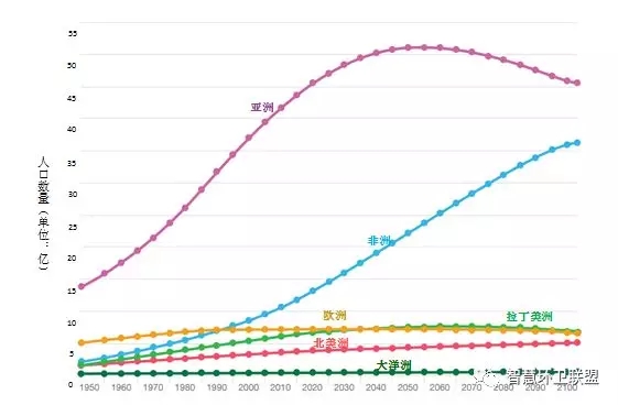 聯(lián)合國的《世界人口展望》對全球未來的人口直到2100年的趨勢做出了預(yù)測,雖然報(bào)告中對未來30年以后的趨勢做出了差別較大的多種預(yù)測,但仍然能夠看出未來全球人口發(fā)展的總體趨勢將會(huì)是,首先上升,之后趨于平穩(wěn),最后既有可能達(dá)到平衡狀態(tài),也有可能開始下降。根據(jù)預(yù)測,亞洲的人口將會(huì)在2050年左右達(dá)到峰值,而非洲人口則會(huì)一直到2100年維持增長的趨勢。圖4展示了全球各地區(qū)自1950年起,到2100年的變化趨勢。