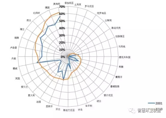 歐盟成員國會(huì)定期收集回收利用率的數(shù)據(jù),因此擁有系統(tǒng)的數(shù)據(jù)記錄,但即便如此,成員國對回收利用的定義卻也仍然存在差異——一些國家將以回收利用為目的進(jìn)行收集的比例當(dāng)作回收利用率,一些國家則利用資源回收利用設(shè)施和堆肥設(shè)施的輸出作為計(jì)算的依據(jù);一些國家將焚燒發(fā)電廠最后排出的金屬和集料算入了回收利用率,另一些則將這一部分排除在外。圖9展示了歐盟各成員國在2001年和2011年時(shí)的回收利用率,可以看出,隨著回收利用率較低的成員國向著歐盟目標(biāo)的不斷努力,歐盟的總體回收利用率出現(xiàn)了十分明顯的提升。