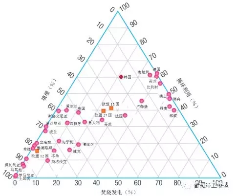 在遠(yuǎn)離圖12左下角的國家中,一些國家主要使用焚燒發(fā)電技術(shù),比如瑞士、瑞典、丹麥、挪威;另一些國家則主要依靠循環(huán)利用,比如荷蘭、比利時(shí)、德國、奧地利。在諸如瑞士、丹麥、荷蘭、奧地利、瑞典、比利時(shí)、丹麥、挪威這些國家,雖然填埋處置率已經(jīng)低于5%,但卻仍然距實(shí)現(xiàn)100%的循環(huán)利用有著很大的距離。