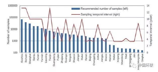 土壤重金屬污染是動態(tài)變化的,重金屬濃度隨污染源的輸入和植物吸收、流水等作用輸出的變化而變化。如何在時間和空間上監(jiān)測土壤重金屬污染狀況的變化特征亦是一個不可忽視的重要問題。通過對前一次樣點的定位,再次采集、分析,比較同一樣點前后兩次土壤重金屬濃度的變化,是最為有效的監(jiān)測土壤重金屬變化的方式。但因土壤的空間異質(zhì)性、采樣方法和統(tǒng)計誤差等影響,土壤重金屬濃度變異度的數(shù)值大小可以通過再次采樣而被檢測是需要考慮的問題。同時,多次大量的樣品采集雖然能夠提高監(jiān)測精度,但成本也相應(yīng)升高,在操作上不現(xiàn)實。監(jiān)測精度和成本的平衡,監(jiān)測區(qū)域樣品數(shù)量和監(jiān)測時間間隔的確定是至關(guān)重要的問題。中國地質(zhì)大學Xia等在全國土壤調(diào)查的基礎(chǔ)上,以主要行政區(qū)域和主要重金屬污染元素為對象,研究土壤重金屬污染變化監(jiān)測的樣品采集數(shù)量和采集時間間隔,發(fā)現(xiàn)由于研究區(qū)域大的空間變異,很難確定土壤重金屬濃度最小可監(jiān)測的變異;根據(jù)成本、可實踐性和檢測的精度,考慮重金屬元素的變異性和設(shè)定變異程度,針對不同區(qū)域推薦了一系列合適采樣數(shù)量,不同區(qū)域檢測的時間間隔為3.3~13.3 年(圖1)。該研究為區(qū)域性土壤重金屬污染變化監(jiān)測提供較好的研究思路和方法。