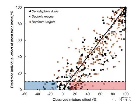 圖2 重金屬復合污染條件下模型預測和觀測的毒性對比