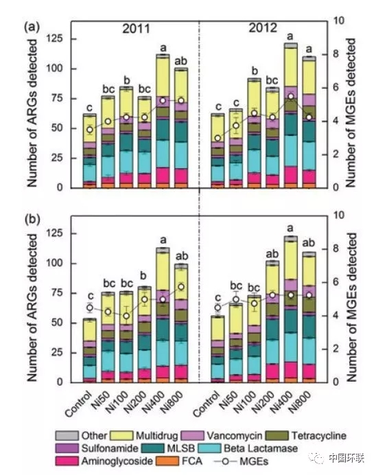 抗生素對細菌感染、致病微生物感染類疾病的防治具有重要作用,但由此而來的抗性基因的快速增加和傳播也威脅著人體健康??剐曰虻难芯吭桨l(fā)受到學者關(guān)注,成為研究熱點。除抗生素選擇產(chǎn)生抗性基因外,環(huán)境中重金屬對抗生素抗性的選擇和傳播擴散具有重要作用。中國科學院生態(tài)環(huán)境研究中心Hu等通過對Ni長期污染土壤誘導的抗性基因進行研究,發(fā)現(xiàn)在長期不同程度Ni污染下,共檢測到149種抗性基因,以多藥和β-內(nèi)酰胺類抗生素抗性為主,抗性基因的頻率和豐度隨Ni污染程度的增加而升高(圖3);抗性基因與可移動抗性原件具有顯著相關(guān)性,表明Ni污染增加了抗性基因的水平轉(zhuǎn)移,該水平轉(zhuǎn)移與intI1整合子有關(guān)。區(qū)別于以往重金屬的直接毒性風險,該研究闡述了重金屬在土壤環(huán)境中的間接風險-增加抗性基因產(chǎn)生和傳播風險。