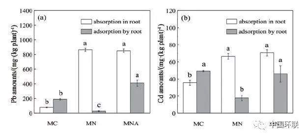 圖6 不同化學試劑對植物根吸附和吸收Pb和Cd的影響