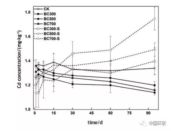 圖8 不同培養(yǎng)時間下生物炭(BC300,BC500,BC700)和改性生物炭(BC300-S,BC500-S,BC700-S)對土壤全量Cd濃度變化的影響