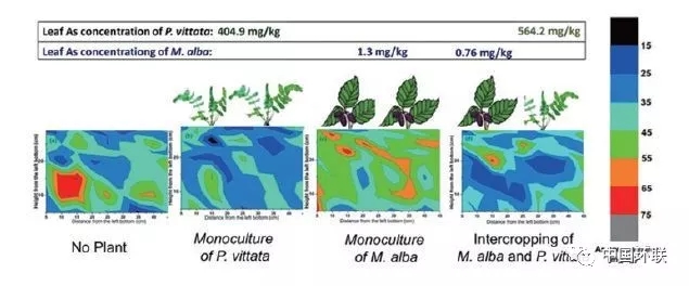 除降低可食作物對重金屬吸收外,在重金屬污染土壤上種植經(jīng)濟作物,阻控重金屬在食物鏈中的傳遞風險,也是污染農(nóng)田安全利用的措施之一。華中農(nóng)業(yè)大學Yang等針對重金屬污染土壤研究重金屬耐性經(jīng)濟作物3種種植模式(油菜-向日葵、油菜-花生、油菜-芝麻),對土壤重金屬去除效應(yīng)和農(nóng)作物中重金屬濃度的影響進行了研究。結(jié)果表明,油菜-向日葵種植模式去除Cd最高,可達459 g·ha-1,去除率為1.98%;利用正己烷提取后作物油符合相應(yīng)標準,去油后種子殘渣再經(jīng)酒石酸鉀提取后,其重金屬濃度低于飼料標準。經(jīng)濟作物與超積累植物間作,在安全生產(chǎn)的同時也能去除土壤污染物,實現(xiàn)修復目的。但是在超積累植物和其他植物間作體系下,超積累植物對重金屬活化和吸收機制還不清楚,超積累植物是否活化重金屬,增加非超積累植物對重金屬吸收。中國科學院地理科學與資源研究所Wan等開展了As超積累植物蜈蚣草和桑樹間作的研究,探討了邊生產(chǎn)邊修復機制。與單作相比,間作處理條件下蜈蚣草中As濃度顯著增加、桑樹As則顯著降低;對不同處理下土壤As的空間分布分析發(fā)現(xiàn),不論單作或間作處理蜈蚣草根周圍土壤As濃度較低,沒有活化土壤As(圖10),且在間作處理下桑樹葉中As濃度符合國家飼料標準。