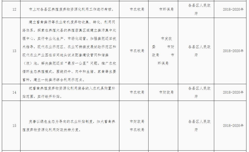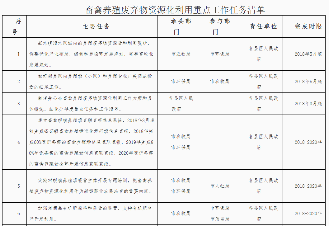(三)落實(shí)屬地管理責(zé)任。落實(shí)“菜籃子”市長(zhǎng)負(fù)責(zé)制,堅(jiān)持保供給與保環(huán)境并重,統(tǒng)籌畜產(chǎn)品供給和畜禽糞污治理。各縣區(qū)政府對(duì)本行政區(qū)域內(nèi)的畜禽養(yǎng)殖廢棄物資源化利用工作負(fù)總責(zé),要結(jié)合本地實(shí)際,依法明確部門(mén)職責(zé),構(gòu)建責(zé)任體系,健全工作機(jī)制,加大資金投入,完善政策措施,強(qiáng)化日常監(jiān)管,確保各項(xiàng)任務(wù)落實(shí)到位。各縣區(qū)人民政府應(yīng)于2018年3月底前制定并公布畜禽養(yǎng)殖廢棄物資源化利用工作方案,細(xì)化分年度的重點(diǎn)任務(wù)和工作清單,并抄送市農(nóng)牧局備案。