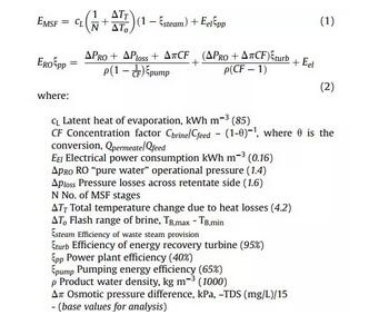 MSF和RO的能耗對比一般用以下公式進行計算,其中公式(1)計算MSF熱法淡化的單位能耗,公式(2)則對應RO的單位能耗。