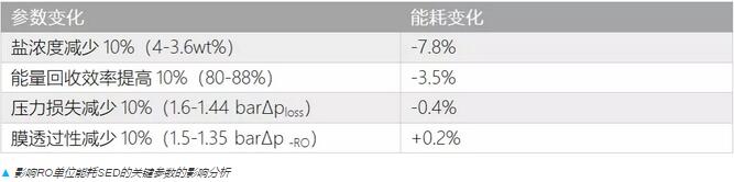 在SED的分析中我們可以得到一些很基礎的重要信息:通過對四個重要參數各自改善10%對能耗變化的計算可以看出,鹽濃度是最顯著的影響因素,而它又主要受濃差極化現象影響。從這個角度來看,與研發(fā)諸如碳納米管等自身具有高滲透性的膜相比,優(yōu)化系統(tǒng)的流體力學獲得好處更多。