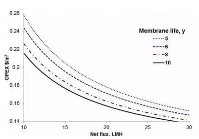 通過對主要參數的計算對比可以發(fā)現,膜通量是OPEX中影響力最高的因子,因為它同時影響了單位能耗和膜更換的成本。