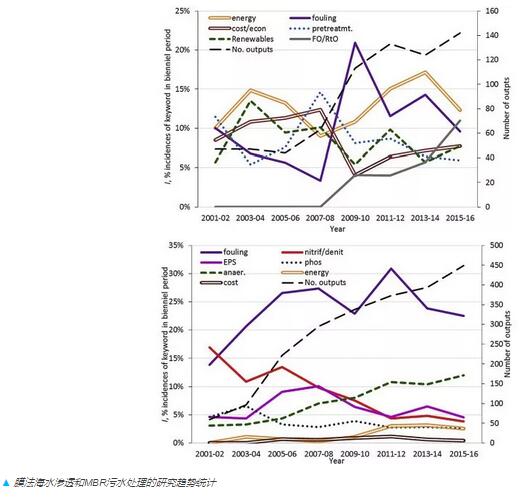 盡管能耗不是MBR研究的最主要焦點,通量卻成為其關于單位能耗的研究重點,而厭氧MBR的研究也穩(wěn)定增長;