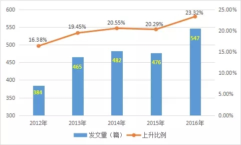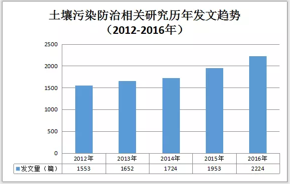 圖2土壤污染防治相關(guān)研究歷年發(fā)文趨勢(shì)(2012-2016)