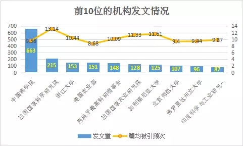 圖3 全球土壤污染防治發(fā)文量位居前10位的機(jī)構(gòu)發(fā)文情況(2012-2016年)