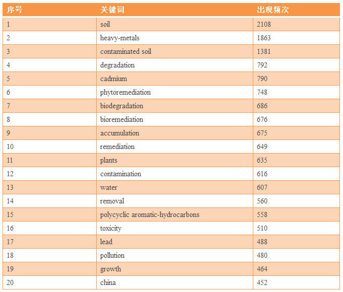表6 土壤污染防治領(lǐng)域中文關(guān)鍵詞出現(xiàn)頻次信息(TOP 20)