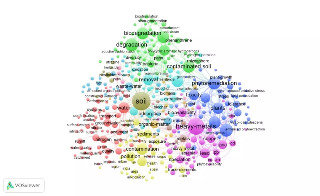 將web of science 上檢索到的9323條英文數(shù)據(jù)導(dǎo)入VOSviewer,共分析了491個(gè)關(guān)鍵詞,得出的高頻關(guān)鍵詞見表3。據(jù)統(tǒng)計(jì),soil(土壤),heavy-metals(重金屬),出現(xiàn)頻次最高,可見重金屬的污染防治一直是領(lǐng)域的關(guān)注重點(diǎn)。degradation(退化)排名第四,反映出近5年來土壤退化問題備受關(guān)注。此外,植物修復(fù)和微生物修復(fù)也是近來的研究熱點(diǎn)。