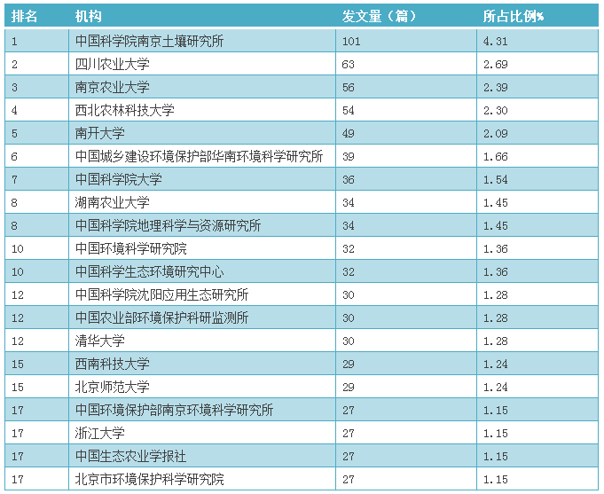 表5 我國(guó)土壤污染防治論文數(shù)量排名前20位機(jī)構(gòu)的發(fā)文情況(2012-2016年)