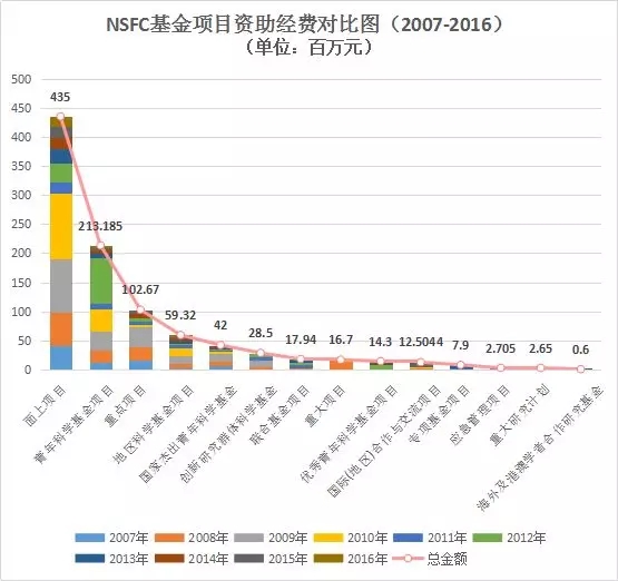 圖10 國(guó)家自然科學(xué)基金項(xiàng)目資助經(jīng)費(fèi)對(duì)比圖 (2007-2016年)