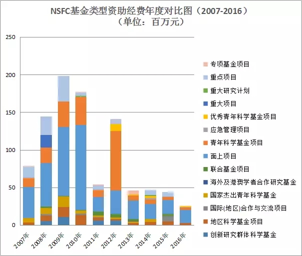 圖11 國(guó)家自然科學(xué)基金基金類型資助經(jīng)費(fèi)年度對(duì)比圖(2007-2016年)