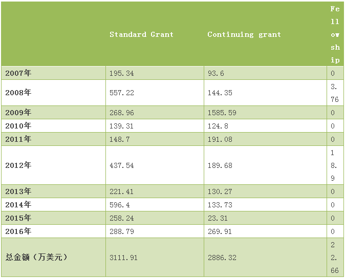 表8 美國(guó)國(guó)家科學(xué)基金項(xiàng)目資助類型經(jīng)費(fèi)表(2007-2016年)