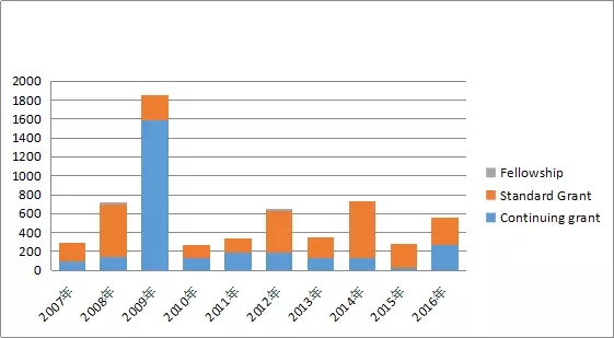 圖12:美國(guó)國(guó)家科學(xué)基金項(xiàng)目資助經(jīng)費(fèi)年度趨勢(shì)圖(2007-2016)