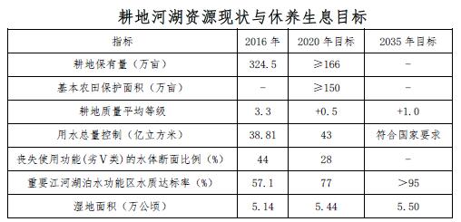 到2020年,耕地數(shù)量穩(wěn)定、質(zhì)量提高,河湖生態(tài)空間有效恢復(fù),濕地面積增加,耕地河湖生態(tài)功能有效改善,資源有效保護(hù)和高效利用的政策與技術(shù)支撐體系基本建立。到2035年,耕地河湖資源利用與養(yǎng)護(hù)全面步入良性循環(huán),資源休養(yǎng)生息制度體系更加完善,形成資源利用高效、生態(tài)系統(tǒng)穩(wěn)定、農(nóng)業(yè)可持續(xù)發(fā)展、水生態(tài)環(huán)境優(yōu)良的新格局,實現(xiàn)人與自然和諧共生。