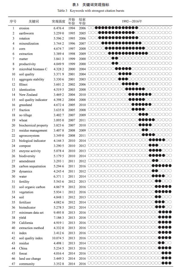 土壤質(zhì)量概念的產(chǎn)生與發(fā)展有著深刻的時(shí)代背景和需求。人類發(fā)展的階段性和動態(tài)性、全球氣候變化與人類活動影響的加劇、學(xué)科的不斷交融是決定土壤質(zhì)量主題演變的主要因素。土壤質(zhì)量在20 多年的發(fā)展階段中,涌現(xiàn)了一些標(biāo)志性的經(jīng)典文獻(xiàn),引發(fā)了大量學(xué)者關(guān)注,從而產(chǎn)生了新的研究點(diǎn)。依據(jù)Citespace V理論和分析結(jié)果,本文著重對文獻(xiàn)中心性高于0.03、突現(xiàn)性高于4、共被引頻次大于30 的關(guān)鍵文獻(xiàn)進(jìn)行分析,綜合以上量化指標(biāo),對該領(lǐng)域研究熱點(diǎn)及其變遷進(jìn)行了解析。在研究趨勢方面,截取突現(xiàn)性大于4,開始年份為2011年,結(jié)束年份為2016年的關(guān)鍵詞進(jìn)行了分析。