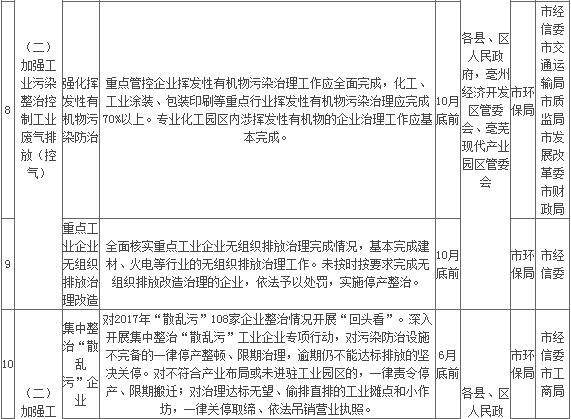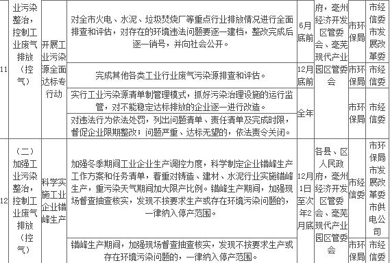 5. 開展工業(yè)污染源全面達標專項行動。2018年6月底前,對全市火電、水泥、垃圾焚燒廠等重點行業(yè)排放情況進行全面排查和評估,對存在的環(huán)境違法問題要逐一建檔,整改完成后逐一銷號,并向社會公開。2018年底前,完成其它各類工業(yè)行業(yè)廢氣污染源排查和評估;實行工業(yè)污染源清單制管理模式,抓好污染治理設施的運行監(jiān)管,對不能穩(wěn)定達標排放的企業(yè)限期改造。對違法行為依法進行處罰,同時列出問題清單、責任清單及完成時限,督促企業(yè)限期整改,徹底解決問題;問題嚴重、整改達標無望的,依法責令停產關閉。(責任單位:各縣、區(qū)人民政府,亳州經濟開發(fā)區(qū)管委會、亳蕪現代產業(yè)園區(qū)管委會;牽頭部門:市環(huán)保局,配合單位:市經信委、市發(fā)展改革委)