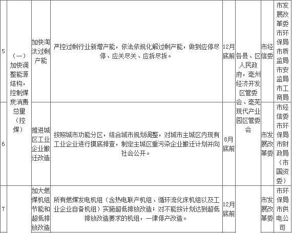 1. 加快燃煤機組超低排放和節(jié)能改造。2018年底前,全市所有燃煤發(fā)電機組(含熱電聯(lián)產機組、循環(huán)流化床機組以及工業(yè)企業(yè)自備機組)全部實施超低排放改造。對不能按計劃達到超低排放改造要求的機組,一律停產改造。(責任單位:各縣、區(qū)人民政府,亳州經濟開發(fā)區(qū)管委會、亳蕪現代產業(yè)園區(qū)管委會;牽頭部門:市發(fā)展改革委,配合部門:市環(huán)保局、市供電公司)
