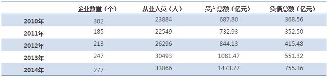 截至2014年,我國規(guī)模以上的污水處理企業(yè)數(shù)量達到了277家,從業(yè)人員達到了33866人,相比上年有大幅度增加,平均每家企業(yè)從業(yè)人員達到122人。其中規(guī)模以上污水處理企業(yè)資產(chǎn)總額達到1473.77億元,相比上年增長36.27%,平均每家企業(yè)總資產(chǎn)規(guī)模為5.32億元;負債總額達到755.36億元,相比上年增長37.01%,平均每家企業(yè)凈資產(chǎn)規(guī)模為2.73億元/家。從2010年到2014年,資產(chǎn)總額年均復合增長率達到了16.46%,負債總額年均復合增長率達到了15.43%,資產(chǎn)增長速度高于負債增長速度。