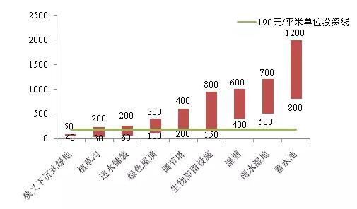2015年10月9日在國務院例行政策吹風會上,住建部已選擇16個城市開展“海綿城市”建設試點,計劃3年內(nèi)投資865億元,建設面積450多平方公里,按此計算,每平方公里投資約1.9億元(折合190元/平米),而實踐中大部分海綿城市相關的低影響開發(fā)單項設施投資均在190元/平米之上(圖1)。