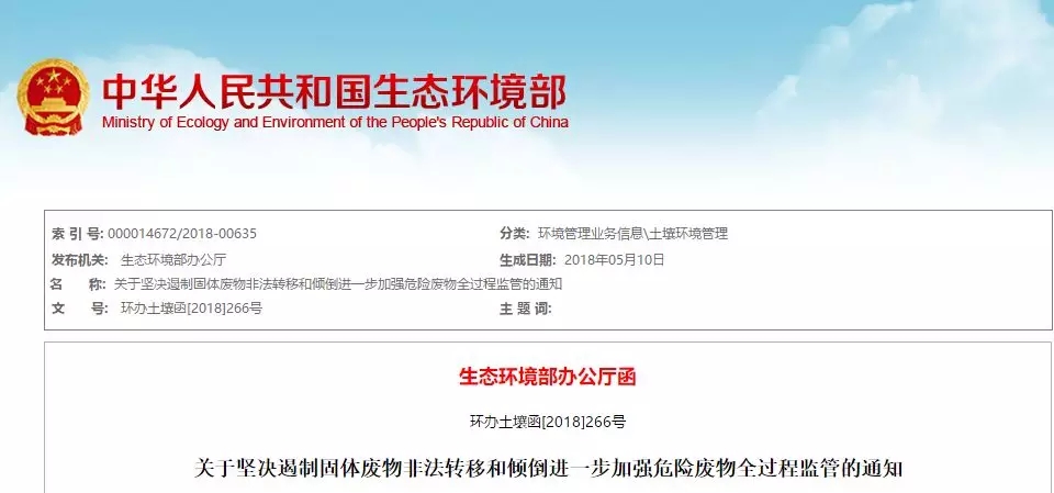 生態(tài)環(huán)境部日前印發(fā)了《關(guān)于堅決遏制固體廢物非法轉(zhuǎn)移和傾倒 進一步加強危險廢物全過程監(jiān)管的通知》(環(huán)辦土壤函〔2018〕266號,以下簡稱《通知》)。