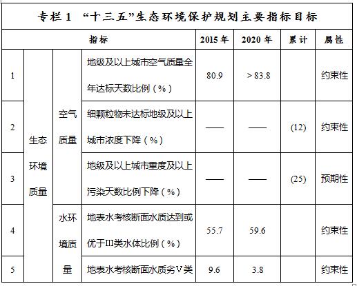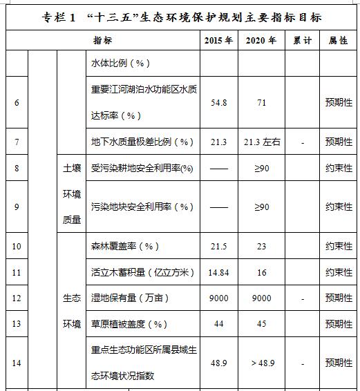 ——環(huán)境質(zhì)量控制目標(biāo)指標(biāo)。到2020年,大氣環(huán)境質(zhì)量方面,地級(jí)及以上城市空氣質(zhì)量全年達(dá)標(biāo)天數(shù)比例平均達(dá)到83.8%以上,重度及以上污染天數(shù)比例下降25%,未達(dá)標(biāo)地級(jí)及以上城市PM2.5年均濃度下降12%。水環(huán)境質(zhì)量方面,全區(qū)地表水質(zhì)量考核斷面水質(zhì)達(dá)到或優(yōu)于Ⅲ類比例總體達(dá)到59.6%,劣Ⅴ類水質(zhì)比例控制在3.8%,重要江河湖泊水功能區(qū)水質(zhì)達(dá)標(biāo)率達(dá)到71%,全區(qū)地下水質(zhì)量考核點(diǎn)位水質(zhì)級(jí)別保持穩(wěn)定且極差比例控制在21.3%。土壤環(huán)境質(zhì)量方面,全區(qū)土壤環(huán)境質(zhì)量總體保持穩(wěn)定,農(nóng)用地和建設(shè)用地土壤環(huán)境安全得到基本保障,受污染耕地安全利用率和污染地塊安全利用率均達(dá)到90%以上。生態(tài)環(huán)境質(zhì)量方面,森林覆蓋率達(dá)23%,活立木蓄積量達(dá)16億立方米,濕地保有量達(dá)9000萬(wàn)畝,草原植被蓋度達(dá)到45%,重點(diǎn)生態(tài)功能區(qū)所屬縣域生態(tài)環(huán)境狀況指數(shù)達(dá)到48.9以上。