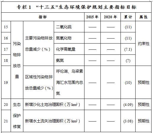 ——污染物排放總量控制目標(biāo)。到2020年,全區(qū)化學(xué)需氧量、氨氮、二氧化硫和氮氧化物排放總量分別控制在77.66萬(wàn)噸、4.37萬(wàn)噸、109.56萬(wàn)噸和101.37萬(wàn)噸以內(nèi),比2015年的83.56萬(wàn)噸、4.69萬(wàn)噸、123.09萬(wàn)噸和113.88萬(wàn)噸分別減少7.1%、7%、11%和11%。呼倫湖、烏梁素海匯水范圍內(nèi)總氮減少10%。