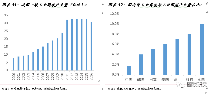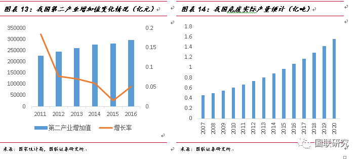 ②第二產(chǎn)業(yè)增加值測算法:由于危廢排放的企業(yè)多數(shù)來自于化工、有色等中游制造企業(yè),我們認(rèn)為危廢的實際產(chǎn)生量將與第二產(chǎn)業(yè)的景氣度是呈現(xiàn)正相關(guān)性。2007年至2016年,我國第二產(chǎn)業(yè)的增加值由11.58萬億元增長到29.65萬億元,復(fù)合增長率達(dá)9.91%,2007年污染源第一次普查時危廢實際產(chǎn)量為4573萬噸,在默認(rèn)普查數(shù)據(jù)為準(zhǔn)確數(shù)據(jù)的情況下,按照9.91%的危廢增長速率進行測算,2016年我國危廢實際產(chǎn)生量將達(dá)到1.07億噸。
