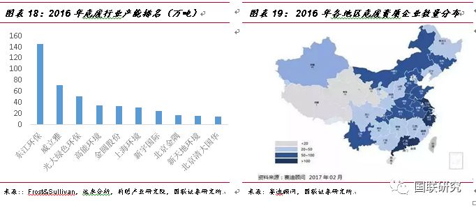 行業(yè)集中度低、規(guī)模小,公司處于絕對領(lǐng)先地位。我國的危廢行業(yè)的市場參與者眾多,但是具有規(guī)模效應(yīng)的企業(yè)很少,目前我國危廢行業(yè)呈現(xiàn)出的特征主要有以下幾點:①行業(yè)集中度低:根據(jù)Frost&Sullivan、遠(yuǎn)卓分析、前瞻產(chǎn)業(yè)研究院的統(tǒng)計數(shù)據(jù),截止 2016 年,行業(yè)內(nèi)排名前十大公司僅占總設(shè)計處置能力的6.8%,其中東江環(huán)保市占率為2.26%,處絕對領(lǐng)先地位;②危險廢物產(chǎn)生量與處理能力分布不匹配。2016年我國持危險廢棄物經(jīng)營許可證的企業(yè)數(shù)量為2149家,主要集中于長三角和珠三角區(qū)域,欠發(fā)達(dá)地區(qū)許可證數(shù)量少。其中江蘇、浙江和廣東三省資質(zhì)企業(yè)數(shù)量共計503家,占全國總數(shù)的30%以上。根據(jù)Frost&Sullivan的數(shù)據(jù),2015年危險廢物產(chǎn)生量主要集中在東部、西北部、中部,分別占總產(chǎn)生量的31%、24%,13%,可以看出華東地區(qū)及西北地區(qū)占危險廢物產(chǎn)生量的大部分。而經(jīng)濟發(fā)達(dá)地區(qū)如華東及華南占危險廢物處理能力的大部分。危廢處置行業(yè)中,東江環(huán)保、光大國際、威立雅中國、新宇國際等企業(yè)進入行業(yè)較早,經(jīng)過多年的發(fā)展已經(jīng)具備規(guī)模和產(chǎn)能優(yōu)勢,而且位于危廢產(chǎn)生量較大的省份,有較強的客戶資源和競爭優(yōu)勢。③經(jīng)營企業(yè)規(guī)模小、處理能力弱。按照2016年核準(zhǔn)經(jīng)營規(guī)模和企業(yè)數(shù)量的數(shù)據(jù)測算,平均每家的核準(zhǔn)處理能力僅為3萬噸/年,并且大部分企業(yè)技術(shù)、資金等實力較弱,日均處理能力超過50噸的企業(yè)占比不到20%,達(dá)到1000噸的僅占0.3%,并且能夠處理25種以上危廢種類的企業(yè)僅為1%,絕大多數(shù)均小于10種。在2017年,東江環(huán)保已具備44類危險廢物經(jīng)營資質(zhì),在危廢行業(yè)中處于絕對領(lǐng)先地位。
